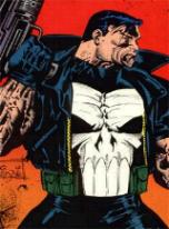 Historia: Frank Castle był kapitanem w Korpusie Marines i służył 5 lat w Wietnamie. Za swe bohaterstwo został dwukrotnie odznaczony Brązową i Srebrną Gwiazdą oraz czterokrotnie Purpurowym Sercem. W kilka lat po wojnie w Wietnamie prowadził specjalne świczenia komandosów marines w stanie Nowy Jork. Będąc na przepustce zabrał żonę i dwoje małych dzieci na piknik do Central Parku. Obok nich rozegrała się bitwa pomiędzy dwoma gangami. Gangsterzy chcąc pozbyc się świadków zastrzelili żonę i dzieci Franka. On sam został ranny, ale przeżył. Zrozpaczony z powodu utraty rodziny zdezerterował z Korpusu tuż przed tym, jak miła otrzymać Prezydenki Medal Wolności. Na kilka miesięcy Castle zniknął z widoku, po czym pojawił sie ponowne w Nowym Jorku. Wyposażył się w doborową broń i stroje bojowe z olbrzymim motywem trupiej czaszki na piersi. Tak przygotowany wyruszył na krucjate przeciwko przestępczości... Komiks: Punisher (z ang. "ten który karze") pojawił się po raz pierwszy na kartach komiksu w 1978 roku w 129 numerze "The Amazing Spiderman". Ponieważ bardzo spodobał się czytelnikom, po licznych miniseriach otrzymał wreszcie swój własny tytuł " The Punisher" (1987) Popularność nie słabła toteż Marvel wypuścił kontynuacje: "Punisher: War Journal" (1991) i "Punisher: War Zone" (1993). Później próbowano jeszcze "Punisher 2099". Pomimo początkowej popularnosci po pewnym czasie sprzedaż komiksów z Punisherem zaczeła spadać - przyczyniły się do tego głównie nienajlepsze scenariusz, które nadały jego przygodom mnóstwo uciążliwego schematyzmu. Postępujący spadek sprzedaży doprowadził w końcu do zamknięcia wszystkich tytułów. Przez nastepne lata Punisher pojawiał się w miniseriach. A pełnoprawny tytuł odzyskał dopiero kilka lat temu za sprawą scenarzysty: Gartha Ennnis'a. Efekt prac jego i rysownika Stevena Dillona można obecnie podziwiac w wydaniu zbiorczym komiksu pt. "Welcome back, Frank" Bonus: Punisher słynie z krótkich acz niezwykle