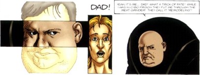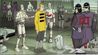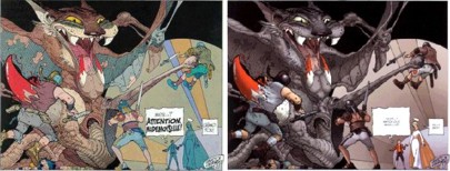 W poprzednim artykule na temat sagi o Incalu napisałem między innymi, że seria przygód Johny'ego Difoola obejmująca zdarzenia sprzed spotkania z Incalem, składa się z 6 części. Tu małe sprostowanie. Składa się ona z 6 części w oryginalnym, francuskim wydaniu i 12 w wersji amerykańskiej, z wydawnictwa Les Humanoides associes (w USA Humanoids Publishing). Poza tym okładek do zeszytów amerykańskich nie rysuje Janjetov (jak to miało miejsce w oryginale), tylko Amerykanin - Jose Ladronn. Wyjątkiem jest tu ostatnia okładka (do zeszytu 12). Wyszła ona bowiem spod ręki Moebiusa i pochodzi z pierwszego albumu nowo powstającego cyklu "Apres l'Incal" ("Po Incalu"), o której za chwilę. Okładka ta przedstawia skok głównego bohatera w Alei Samobójców. Z wydaniem amerykańskim serii "Przed Incalem" jest podobnie, jak z inną wydawaną tam serią Jodorowsky'ego - "Kastą Metabaronów". Każdy album z wydania europejskiego (liczący zazwyczaj 48 lub 64 stron) jest dzielony w Stanach na 2 zeszyty. Wynika to chyba z przyzwyczajenia Amerykanów, nawykłych do takiej właśnie formy wydawniczej. Wracając jednak do tematu, "Avant l'Incal"' jest serią rysowaną przez Zorana Janjetova, oczywiście do scenariusza niezmiennie trwającego na swym posterunku Alexandro Jodorowsky'ego. W pierwotnej (francuskiej) wersji, komiksy były wydawane w "bubblegum colors,"(czyli kolorach gumy balonowej), która to kolorystyka nawiązywała do stylu Moebiusa, tworzącego właśnie w taki sposób środkową część cyklu (tą, która powstała najwcześniej). Tutaj krótkie wyjaśnienie, skąd w ogóle wzięły się kolory "gumy balonowej"? Otóż pewnie wielu z was pamięta "historyjki" z takich gum, jaskrawe i kolorowe. To jest właśnie taka kolorystyka. Dla porównania zamieszczam poniżej ten sam kadr z serii "Przed Incalem" w kolorystyce "gumy balonowej" i pokolorowany komputerowo.