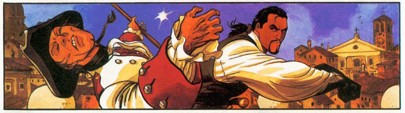Tak przedstawia się początek tej historii. Niektórym z was może być ona już znana, ponieważ komiks ten był drukowany w odcinkach, w magazynie "Świat komiksu" w 2001 roku. Odnośnie fabuły, to musze przyznać, że po przeczytaniu tego komiksu miałem wrażenie lekkiego deja vu. Podobnie bowiem, jak w "Drapieżcach", także i tutaj mamy tajną organizację, której celem jest dzierżenie w rękach władzy i ma ona swoich utajnionych przedstawicieli, w wielu miejscach na świecie - nie jest to więc pomysł zbytnio oryginalny. W sumie jednak wypada przyznać, że tak naprawdę ciężko jest wymyślić scenariusz, w którym nie pojawiłyby się wątki gdzieś już wczesnej wykorzystywane. Ważne jest, czy uda się z takich kawałków zbudować ciekawą i intrygującą całość? I tu docieramy do sedna sprawy, Otóż "Znamię szatana" jest opowieścią, którą czyta się naprawdę dobrze. Ponadto, z całkiem zgrabnie zarysowaną fabułą, doskonale współgrają świetne rysunki Mariniego, co w moich oczach, znacznie podnosi ogólną ocenę albumu. Odnośnie kreski tego rysownika, to tradycyjne ciężko jest tutaj, o jakieś konkretne zarzuty. Bardzo miło ogląda się te rysunki, bo są po prostu dobre. Niektóre kadry wyglądają wręcz jak obrazy malowane na płótnie przez dawnych mistrzów, co bardzo dobrze oddaje klimat opowieści. Dobrze świadczy też o autorach konsultowanie się ze znawcami szermierki i XVIII-wiecznych realiów, w celu wiernego ich oddania (o czym dowiadujemy się z dedykacji, umieszczonych na początku tomu). Album kończy się dosyć gwałtownie, pozostawiając czytelnika z cisnącym się na usta pytaniem - co dalej? W moim odczuciu (posługując się slangiem telewizyjnym) album ten to taki swoisty "pilot" dla kolejnych części serii. Zostajemy tu bowiem, wprowadzeni w realia opowieści i akcja zostaje zawiązana, natomiast na jej rozwinięcie i zakończenie, przyjdzie nam poczekać do kolejnych albumów. Uważam, że "Znamię" jest komiksem udanym i wartym wydanych na niego pieniędzy. Wartka akcja, ciekawa fabuła i piękne rysunki Mariniego tworzą miłą dla oka i przyjemną w czytaniu całość. Zdecydowanie polecam. Nieco więcej informacji na temat serii "Skorpion" możecie znaleźć w KZ nr 11, w artykule Poszukiwacza. Scenariusz: Stéphen Desberg |