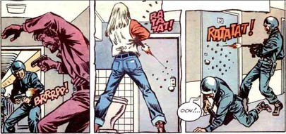OS (One shot) (w wolnym tłumaczeniu "jednostrzałówka") - historia zamykająca się w całości w jednym albumie. One shotem jest np. "Western" duetu Rosiński & Van Hamme, czy "Gwiazda pustyni" - autorstwa Mariniego i Desberga. W odniesieniu do komiksu amerykańskiego, nazwa ta stosowana jest również jako synonim mini crossoverów, takich jak np. "Tomb Rider / Witchblade", opublikowany u nas jako "TM-Semic Wydanie Specjalne" nr 23 (ta historia także zamyka się w jednym albumie). Onomatopeja - czyli wyraz dźwiękonaśladowczy. Jest to środek artystyczny, bardzo typowy dla komiksu i stanowiący obok dymków, jeden z najbardziej charakterystycznych wyróżników tego medium. Poniższe kadry pochodzą z komiksu "Czarna róża" autorstwa J. Wróblewskiego.