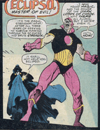 antagonisty, niejakiego Eclipso, ubranego w różowy strój ze złotymi elementami,