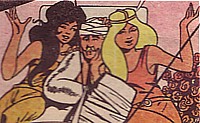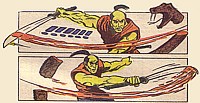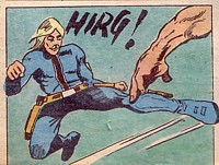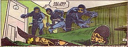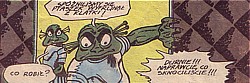 Tak rozpoczyna się trzecia część. Jak już wspomniałem nie ma tutaj kosmicznych potworów, a naszym bohaterom przychodzi zmierzyć się z piraniami, aligatorami i innymi bardziej "przyziemnymi" zagrożeniami. Głównym przeciwnikiem jest tytułowa organizacja terrorystyczna Skorpion. Jeśli zaś chodzi o podobieństwo Tajfuna do Bonda, to w odróżnieniu od agenta, udało mu się zachować nienaganny wygląd swojego garnituru tylko przez połowę komiksu, później jest on już w strzępach.