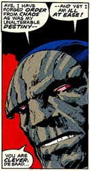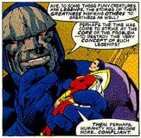 Darkseid, przez większą część opowieści pozostaje w cieniu głównego