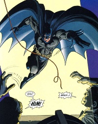 gdy Batman wlatuje przez szklany sufit aby zaskoczyć bandytów,