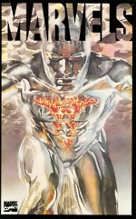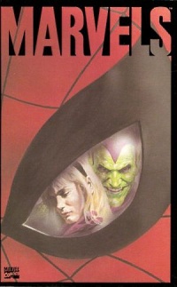 Jednakże to nie tylko w zgrabnie ujętej fabule tkwi główny urok tegoż albumu. Bowiem najważniejszym jego atutem są imponujące stopniem dopracowania kompozycje malarskie autorstwa znanego u nas z "Kingdom Come" Alexa Rossa. Aż trudno uwierzyć, że w chwili premiery "Marvels" ów plastyk miał zaledwie 24 lata! A mimo to nie sposób odmówić mu dojrzałości warsztatowej przejawiającej się w postaci hiperrealistycznych ilustracji wykonanych techniką akwareli. Jeszcze nigdy uniwersum Marvela nie wyglądało tak przekonująco i realistycznie. Nawet Green Goblin, łotr o wizerunku, co tu kryć, kuriozalnym, za sprawą wspomnianego twórcy jawi się jako postać w pełni namacalna. Dodatkowy smaczek stanowi ukazanie w tej konwencji licznych scen znanych z klasycznych komiksów wspomnianego edytora. Tym samym po raz kolejny stajemy się świadkami m.in. debiutu Fantastycznej Czwórki, tragicznej śmierci Gwen Stacy, czy przybycia Galactusa wraz z jego ówczesnym heroldem Silver Surferem. A wszystko to w olśniewającym swą formą ujęciu Alexa Rossa. Nie dziwi zatem, że "Marvels" stało się przepustką do wielkiej kariery rzeczonego (nie bójmy się tego słowa) artysty, który obdarował nas takimi dokonaniami jak wspomniane "Kingdom Come", "Justice" oraz okładkami do licznych serii (m.in. "Astro City", "JSA" i "Justice Society of America"). Trudno wyobrazić sobie lepszego ilustratora w tej roli. To właśnie dzięki niemu na kartach tej opowieści uniwersum Marvela niemal dosłownie budzi się do życia. Warto zaryzykować tezę, że nawet osoby sceptycznie ustosunkowane wobec superbohaterskiej konwencji akurat w tym przypadku powinny być mile zaskoczone.