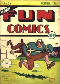 Luty, rok 1935. Major Malcolm Wheeler-Nicholson, uczestnik I Wojny Światowej, dowodzący oddziałem piechoty walczącej z bolszewikami na Syberii, zakłada wydawnictwo i wydaje pierwszy w historii branży komiks, w którym znajduje się wyłącznie oryginalny, stworzony specjalnie do niego materiał (wcześniejsze magazyny opierały się w większości przypadków na przedrukach gazetowych). Nazywa się on "New Fun #1" i szybko da on początek legendarnej dziś serii "More Fun Comics" (nazwę taką dostała już w dziewiątym numerze), która jest chyba jednym z najbardziej rozpoznawalnych symboli Złotej Ery Komiksu. Czym było to wydawnictwo? Opierało się ono na kilku historiach, posiadających monochromatyczne rysunki. O czym były te historie? Jak pisze sam autor, były to "humorystyczne, przygodowe stripy komiksowe" i chyba tak właśnie najlepiej je określić. Prezentowane tam historie były naprawdę najróżniejsze, od kowbojskich westernów (wystąpił tam między innymi Jack Woods - jedna ze słynniejszych postaci komiksowych okresu) po opowieści o króliku Oswaldzie (notabene, postać ta została użyta wbrew prawom autorskim - należała bowiem do koncernu Disneya). Co ciekawe, wśród komiksów znalazła się również adaptacja książki "Ivanhoe". Niestety, karier twórców pierwszej odsłony magazynu nie można uznać za błyskotliwe - żaden z nich nie stal się w przyszłości gwiazdą komiksu, a większość zakończyła swoją przygodę z komiksem na serii "More Fun Comics" właśnie. Podobny los spotykał występujące tu początkowo postacie. Zmiana przyszła wraz z numerem szóstym, gdy do grupy twórców magazynu dołączyli dwaj ludzie, którzy na zawsze odmienili komiksowy rynek - Jerry Siegel i Joe Shuster. Ich pierwsze dzieło po dziś dzień jest określane przez znawców tematu jako pierwszy superbohater, jest też w tym momencie najstarszą postacią, ciągle występującą w komiksach. Panie i panowie, tak właśnie w listopadzie roku 1935 narodził się...