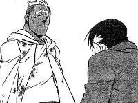A jak ma się sprawa z innymi wątkami? Tak, jak gwarantowała nam zapowiedź, Lin podpisuje pakt z diabłem, lecz pozostaje pytaniem, czy to on czarta wykiwał, czy też sam został wykiwany? Scar poznaje prawdę o wojnie w Ishvarze, Mustang oraz reszta bohaterów dostają propozycję nie do odrzucenia... Słowem - dzieje się. I to dzieje się w sposób całkiem zaskakujący. Seria ta zaskarbiła sobie moją sympatię nieco steampunkowym klimatem i właśnie tego typu niespodziankami, których w takim natężeniu i tak zaskakujących chyba jeszcze w tej historii nie było. Bo w końcu kto by pomyślał, że... Cóż, że w ten właśnie sposób zostanie rozwiązana sprawa odkrycia prawdziwej tożsamości Kinga. Przekonajcie się sami zaglądając do najnowszego tomiku mangi.