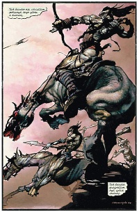 Na każdym kroku widać za to, że znacznie bardziej niż Carey, do pracy przyłożył się rysownik John Bolton. Stworzenie ilustracji do komiksu zajęło artyście aż trzy lata! Jakkolwiek oprawa graficzna jest spójna, od razu rzucają się w oczy różnice w sposobie ukazania przez Boltona świata realnego i baśniowego. W pierwszym z nich ilustracje wyglądają niczym monidła; postacie głównie portretowane są na podstawie zdjęć, z dbałością o zachowanie właściwych proporcji i szczegółów anatomicznych. W tym elemencie szczególnie razi niedopracowanie teł, zwłaszcza w szerokich planach, bowiem bohaterowie wydają się być od nich oderwani, zawieszeni gdzieś w pustce. W efekcie ilustracje są momentami wyjątkowo sztuczne. Znacznie ciekawsze rysunki opracował artysta dla wydarzeń rozgrywających się w świecie Magicznego Królestwa. Tu Bolton uwolnił swoją wyobraźnię i dał się ponieść kreatywności. Baśniowe, zdeformowane stworzenia utrzymane są w surrealistycznym stylu i przywodzą na myśl obrazy Salvadora Dalí. Kolorystyka stwarzająca psychodeliczny nastrój również w tej części wygląda dużo lepiej, niż w komiksowym, rzeczywistym świecie. Na koniec chciałbym zwrócić uwagę na fakt, że Bolton wyraźnie czuje się lepiej w kadrach wypełniających całą planszę - całostronicowe ilustracje zdecydowanie należą do najlepszych w komiksie. Czasami ma się wrażenie, że artysta nie radzi sobie z komiksowym językiem wypowiedzi. Jest to szczególnie widoczne w kulminacyjnej scenie. Mimo wyżej wspomnianych potknięć, niewątpliwie należy się artyście uznanie za pracę, którą włożył w wykonanie ilustracji.