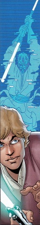 Drugą opowieścią, którą redaktor Jacek Drewnowski zdecydował się nam zaprezentować, są "Mroczne Widma" i powiem szczerze, że najchętniej na tym właśnie zakończyłbym recenzowanie tej historii i przeszedłbym dalej. Dlaczego? Otóż nie dostrzegam w tym komiksie absolutnie żadnej zalety. Akcja toczy się na ojczystej planecie znanego z części pierwszej filmowej sagi "Gwiezdnych Wojen" Dartha Maula i wierzcie, lub nie, opowiada o jego powrocie do życia. Całą zagadkę powrotu tej maszyny do zabijania rozwiązuje nie kto inny, jak sam Luke Skywalker, co podsumować chciałbym niesamowicie oddającym ten komiks słowem "wzdech". Z tego, co udało mi się dowiedzieć, w oryginale "słowo" to brzmiało ">sigh<" i spokojnie pan Maciek Drewnowski mógł przetłumaczyć to na "ech", bądź coś podobnego. Poza tą jedną kwestią, tłumaczenie to najlepszy element całej historii. Rysunki wykonane przez Francisca Paronziniego i kolorowane przez Dave'a Nestelle'a, którego widzimy w tym zeszycie już drugi raz, nie ciekawią absolutnie niczym, podobnie zresztą, jak scenariusz Joego Casey'a.