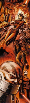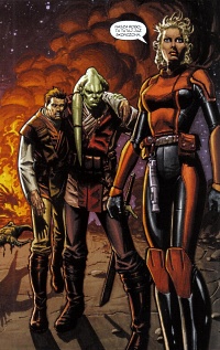 Teraz przyszła pora na najdłuższą i zdecydowanie najlepszą historię zawartą w tym zeszycie, czyli "Cienie i Światło". Okładka tego "Star Wars Komiksu" co prawda mówi nam wyraźnie, że jego gwiazdami są Han Solo i Luke Skywalker, ale ich historie przy tej stają się ledwie zauważalne. Komiks na podstawie scenariusza Joshuy Ortegi przenosi nas o 3993 lat przed wydarzenia znane z czwartej części filmów spod znaku "Star Wars", czyli do czasów wydawanej w USA serii "Knights of the Old Republic" utrzymującej klimat gier komputerowych pod tym samym tytułem. Poznajemy w nim Jedi, łowców bestii zwanych Terentatekami, żywiących się wrażliwymi na Moc istotami. Dwójka ludzi, Durom Quesl Droma i Shaela Nuur oraz Twi'lek Guun Han Saresh zostają wysłani na planetę złowrogich Sithów - Korriban, w poszukiwaniu ostatnich bestii. Część czytelników może kojarzyć wydane przez Egmont "Opowieści Jedi", których akcja toczyła się na tysiąc lat przed wydarzeniami opisanymi w tym komiksie. Jeśli zakochaliście się w tamtych historiach, to możecie być pewni, że ta jest zupełnie inna. Tak samo jak gry komputerowe zrywały całkowicie z nieco "średniowiecznym" klimatem "Opowieści Jedi", do których nawiązywały, tak ten komiks ewidentnie nawiązuje klimatem do serii gier. Jakie są tego konsekwencje? Najbardziej razić może zamiana mrocznego i mistycznego Korriban w planetę, na której gromadzą się męty wszechświata, lecz jeśli podejdzie się do tego z przymrużeniem oka, to da się ten pomysł przełknąć. Jako sympatyk świata "Gwiezdnych Wojen" staram się nie traktować tego wszystkiego na zasadzie "jednej chronologii", lecz bardziej jako "elseworldy". Dla mnie elementy świata "Star Wars" nawiązują do siebie nawzajem, lecz nie są ze sobą sztywno powiązane. Wróćmy jednak do samych "Cieni i Światła". Do pełnego zrozumienia tego komiksu niezbędna niestety jest pewna wiedza na temat gier i komiksów "Knights of the Old Republic", aczkolwiek nie można potraktować tego jako wadę ze względu na grupę docelową. Za to ogromną zaletą są rysunki Dustina Weavera kolorowane przez Michaela Atiyeh'a które tworzą świetny klimat pasujący do tego, co czytamy. Kolejnym plusem są wyraźnie zarysowane postaci, zwłaszcza Guun, który polując na potwory sam się staje potworem. Komiks ten zdecydowanie jest perełką tego zeszytu.