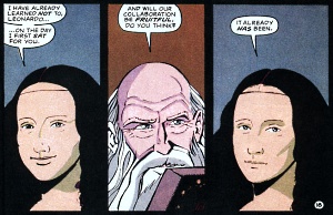 Lepiej wypada historia z przeszłości, choć i ona ma swoje mankamenty. Fabuła jest tu mocno skrótowa, nie wykorzystuje w pełni potencjału pomysłu, o bardziej złożonej warstwie psychologicznej też można zapomnieć. Do tego Moench nie trzyma się za bardzo faktów historycznych (dla przykładu Leonardo nie mógł w 1490 r. być we Florencji - 8 lat wcześniej wyjechał do Mediolanu), ale to przy odrobinie dobrej woli można wybaczyć, wszak nie jest to komiks historyczny.