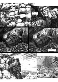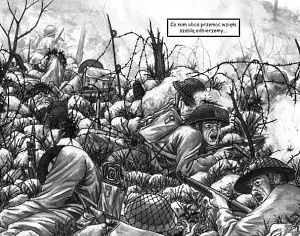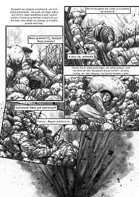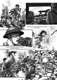 Autorka ilustracji sprawia wrażenie zdolnej entuzjastki rysunku, która jednak nie miała okazji "szlifować" swych umiejętności w ramach regularnego kursu plastycznego. Efekt jej prac to raczej przejaw osobistego zacięcia i przemożnej chęci realizacji swej pasji niż w pełni wypracowanego profesjonalizmu. Widoczna w tle architektura, elementy wojskowego ekwipunku czy też pojazdy są bez zarzutu, a momentami wręcz imponują detaliczną precyzją (np. na stronie 62, 68 czy 69). Nie sposób także dopatrzeć się istotniejszych błędów w proporcjach postaci. Niestety dalece bardziej problematycznie jawi się brak biegłości pani Gabrieli Becli w ukazywaniu twarzy postaci. Chociaż fizjonomie znaczących bohaterów (Wańkowicz, Grebowski) są wystarczająco charakterystyczne, to jednak niemal nagminnie stwarzają wrażenie niedopracowanych i mało naturalnych. Wiążę się to także z najbardziej chyba dostrzegalną bolączka autorki - niskim stopniem biegłości w ukazywaniu skrótów perspektywicznych. Nie da się ukryć, że ta część warsztatu rysownika należy do szczególnie trudnych. Niemniej w omawianym przypadku jest to szczególnie widoczne i momentami aż żal, że szczegółowo dopracowany detal czy postać psuje właśnie brak trafnego ujęcia m.in. perspektywy linearnej. Właściwe zaznaczenie struktury odzieży ("zagięć" materiału etc.) to również zagadnienie z którym graficzka chyba powinna jeszcze nieco "powalczyć". Zaistniałe błędy rysunkowe z miejsca wzbudzają skojarzenia z opublikowanymi na przełomie lat osiemdziesiątych i dziewięćdziesiątych komiksami Romana Pierzgalskiego (m.in. "Good Morning Wietnam" i "Spring Young"). Wówczas, gdy zapotrzebowanie na komiks w niemal każdej postaci wciąż pozostawało niezaspokojone, czytelnik traktował z rezerwą podobnego rodzaju niedociągnięcia. Obecnie, gdy polski odbiorca jest już zaznajomiony z dokonaniami klasyków europejskich, amerykańskich i japońskich, tego typu fuszerki nie powinny mieć miejsca. Niemniej w tym objętościowo rozległym komiksie (128 stron) z kolejnymi stronnicami da się dostrzec wyraźną tendencje zwyżkującą.