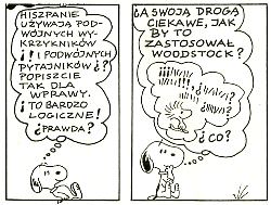 Co ciekawe, a o czym wcześniej nie wiedziałem, jak wyjaśnia w pierwszej opowieści sam Snoopi - Hiszpanie używają podwójnych wykrzykników i pytajników, w tej właśnie formie zostało to wpisane po przetłumaczeniu (przez Carlosa Marrodana) w dymki. Bardzo ciekawa forma, niespotykana wcześniej w wydanych w Polsce hiszpańskojęzycznych komiksach.