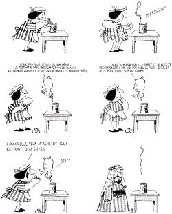 Fani zagadkowego, nieco surrealistycznego dowcipu będą w siódmym niebie. Ale jak ktoś woli siermiężny dowcip rodem ze spamu i darmowych gazetek też nie będzie zawiedziony. Przykładem zaprezentowana plansza, gdzie gospodyni domowa uwalnia dżina, w zamian za co może wypowiedzieć życzenie. Ponieważ chciałaby mieć dużo pieniędzy, dżin zamienia ją w bogatego Araba z kindżałem za pasem i pierścieniami na palcach. Nie jest to może bardzo śmieszne, ale świetnie narysowane i stanowi odmianę od przeważających tu dowcipów, od których mózg się może zagotować.